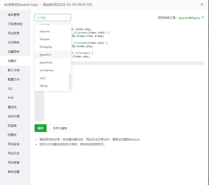 在设置弹窗中,左侧找到伪静态选项卡,并切换成它